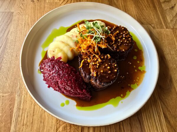 z gorczycą / puree ziemniaczane z boczkiem / buraki zasmażane