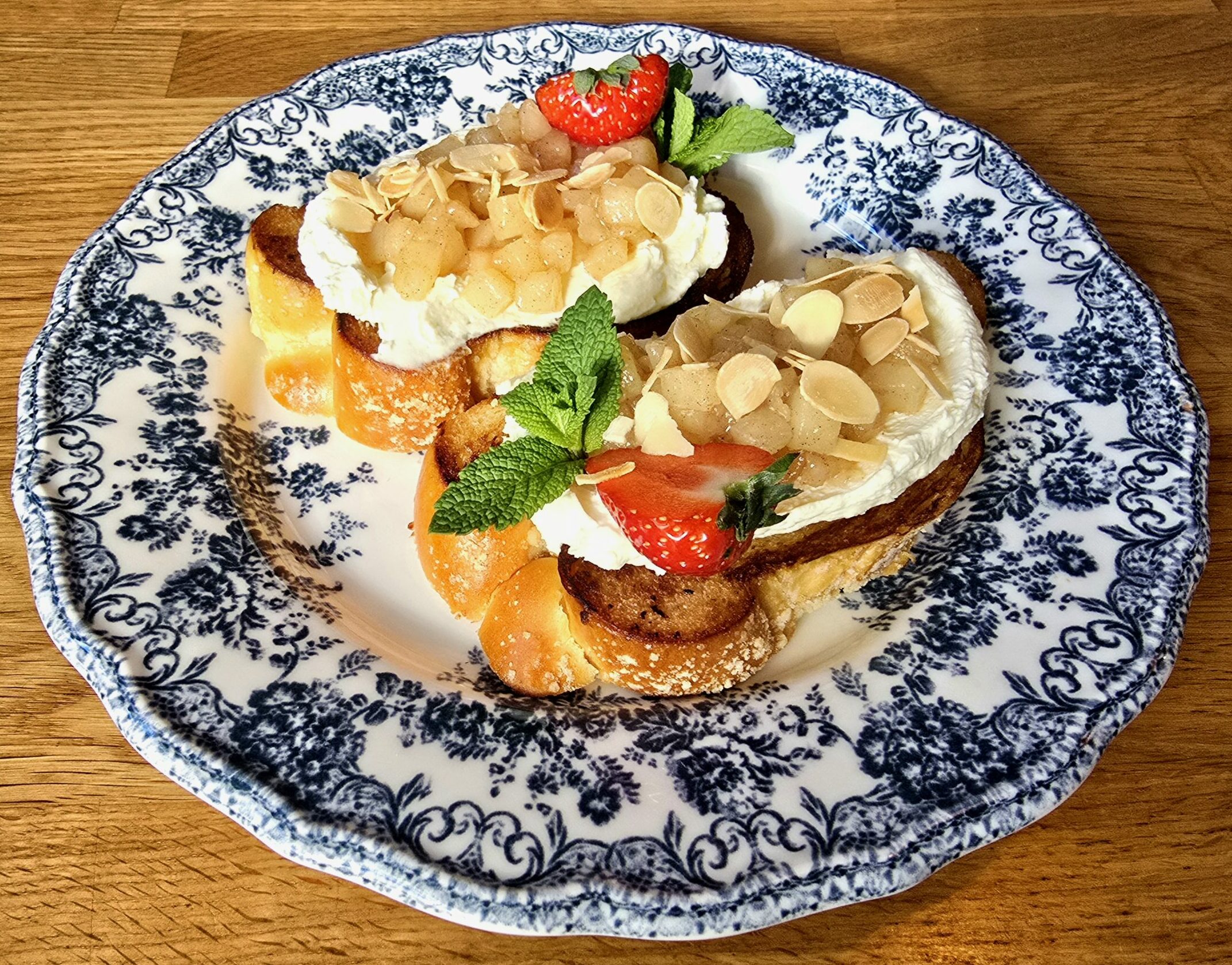 chałka, jabłka prażone z cynamonem, krem mascarpone, migdały