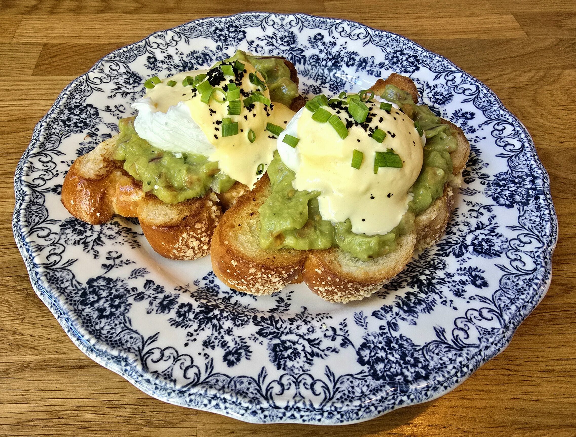 chałka, guacamole z pomidorem, czerwona cebula, jajka w koszulce, sos holenderski