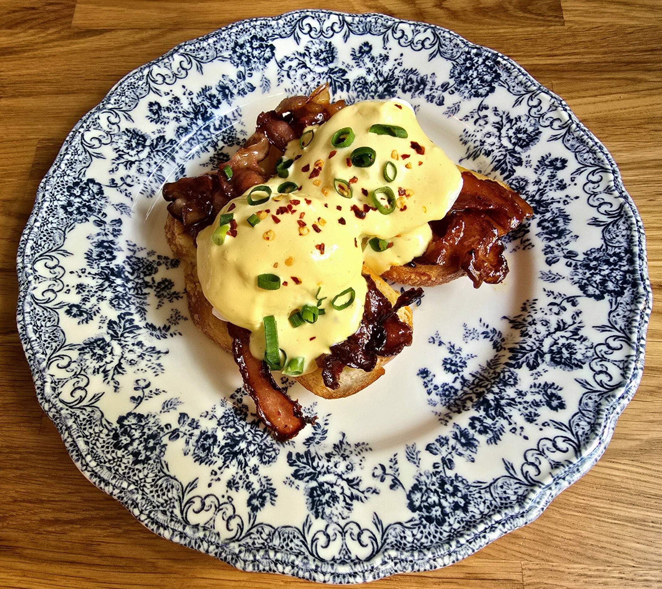 chałka, becon, syrop klonowy, jajka w koszulce, sos holenderski