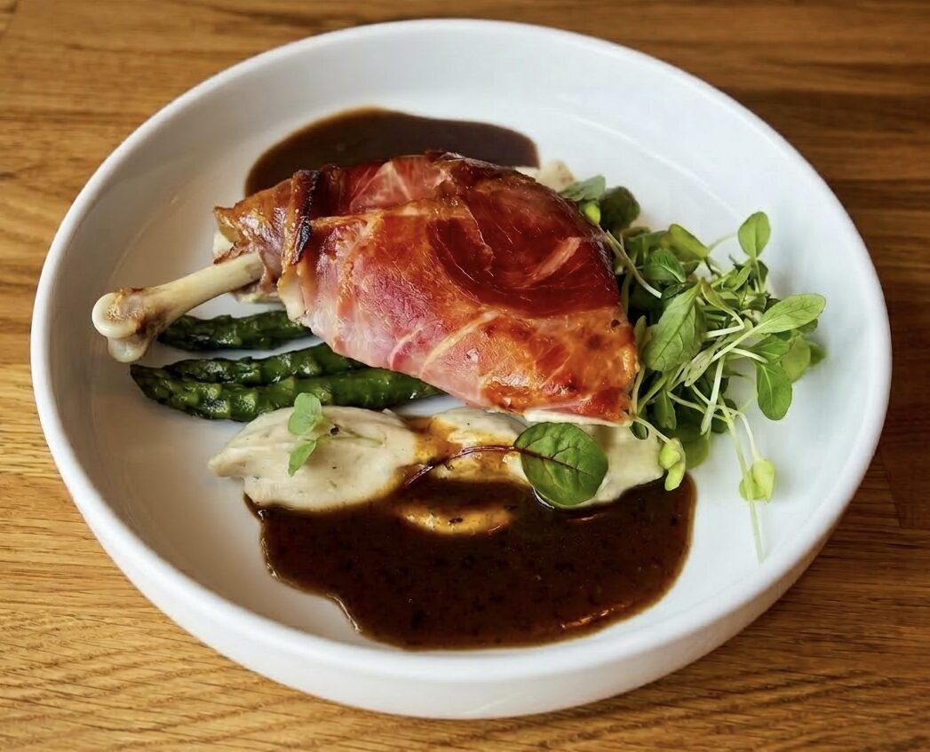 mozzarella / jalapenio / szynka prosciutto / puree pietruszkowe z nutą trufli / szparagi / sos demi glace