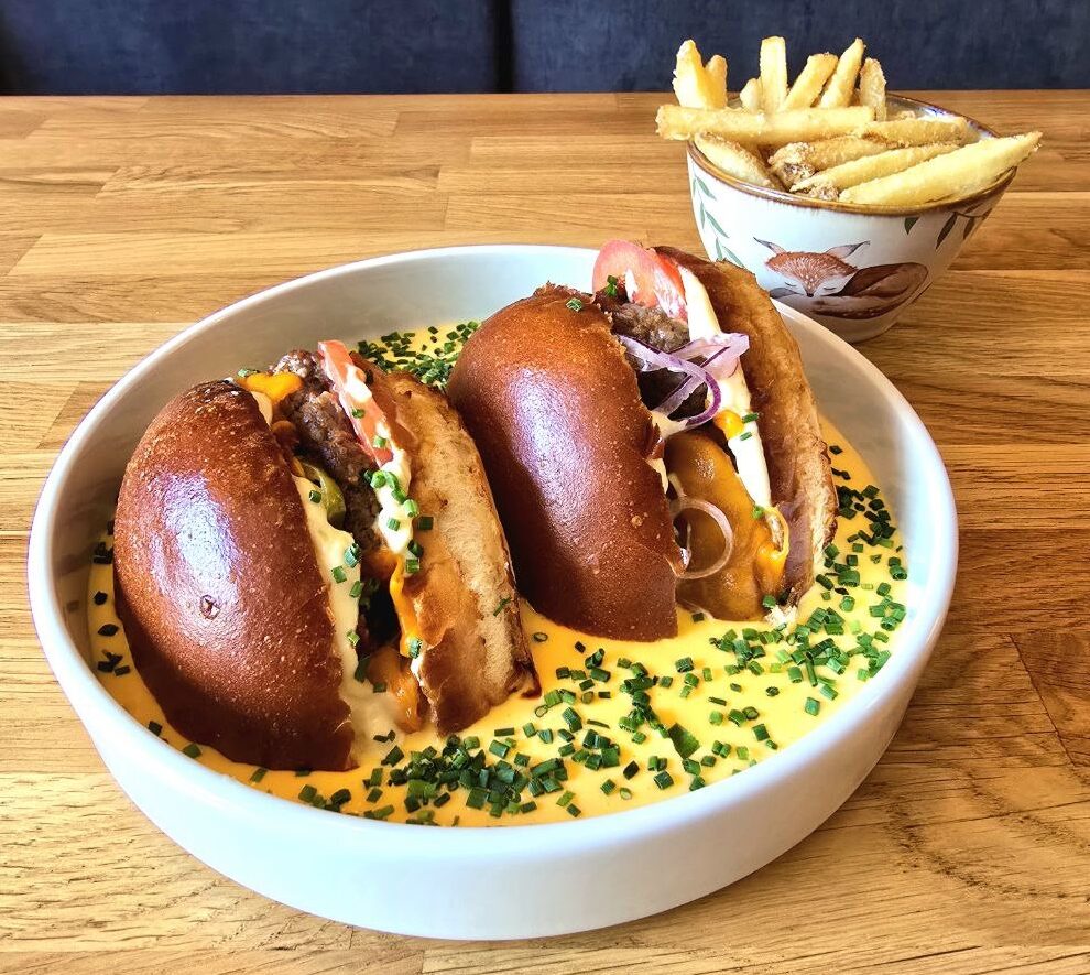 wołowina 180g / dżem beconowy / jalapenio / cheddar 2x / pomidor / majonez / cebula / sos serowy / szczypiorek / frytki