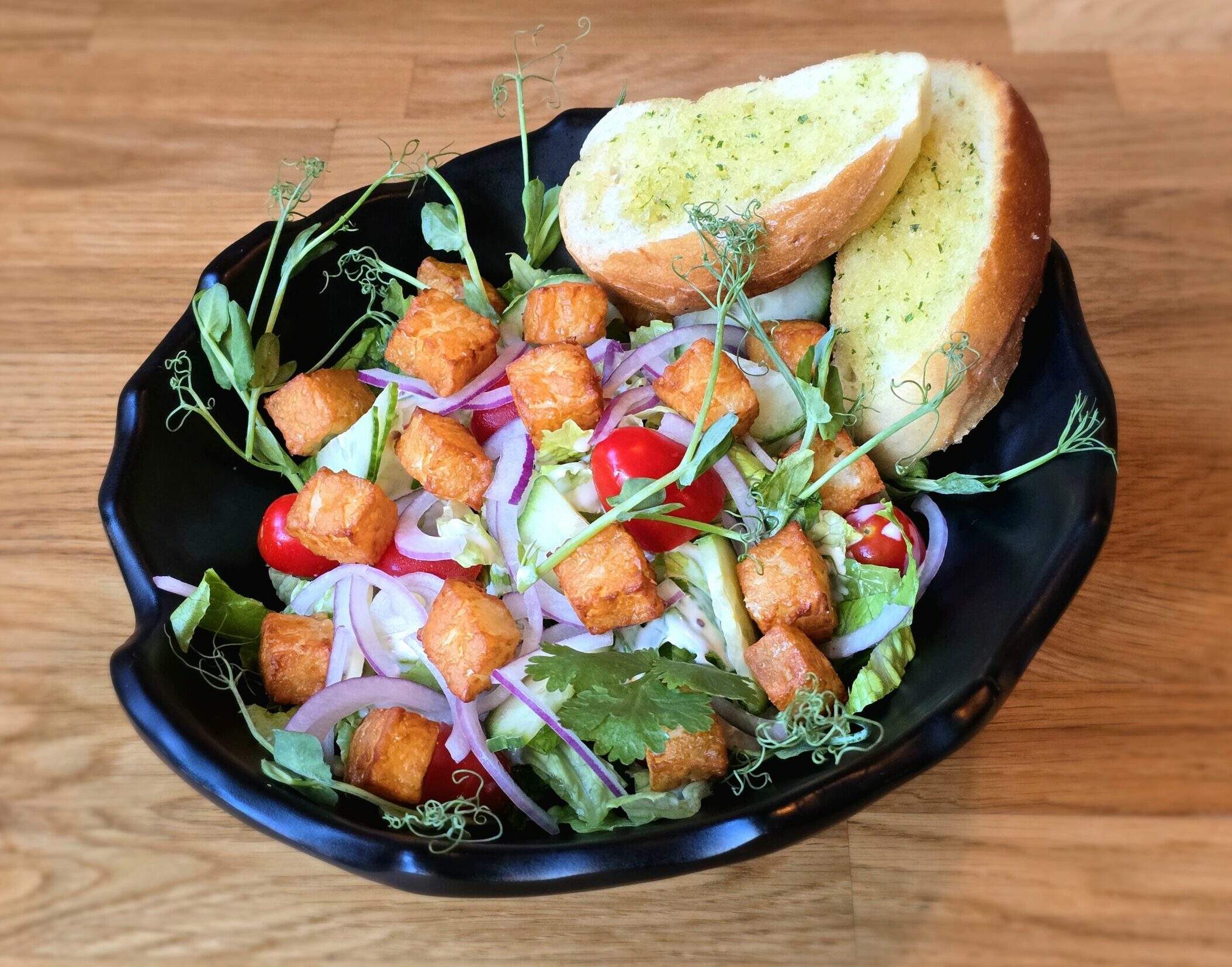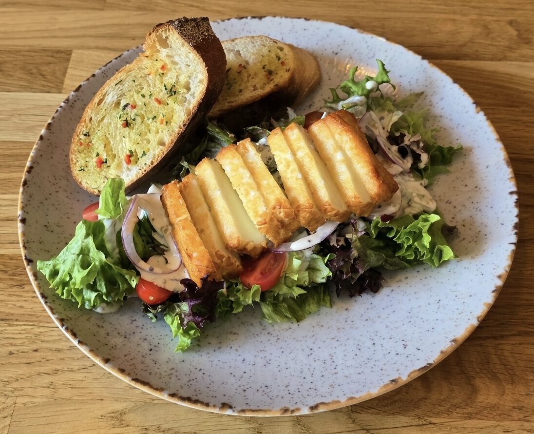 mix sałat / grillowane halloumi / pomidorki cherry / czerwona cebula / ogórek świeży / sos musztardowo – miodowy / grzanki