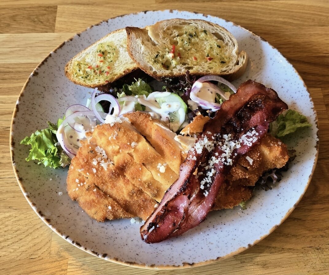 Mix sałat / kurczak w panierce/ pomidorki cherry / ogórek świeży / czerwona cebula / sos musztardowo – miodowy / bekon / parmezan / grzanki z masłem ziołowym