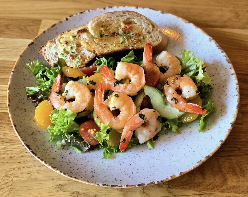 krewetki 6 szt. na maśle  / mix sałat / pomidorki cherry / mandarynka / sos venegret pomarańczowy / ogórek świeży / grzanki z masłem ziołowym